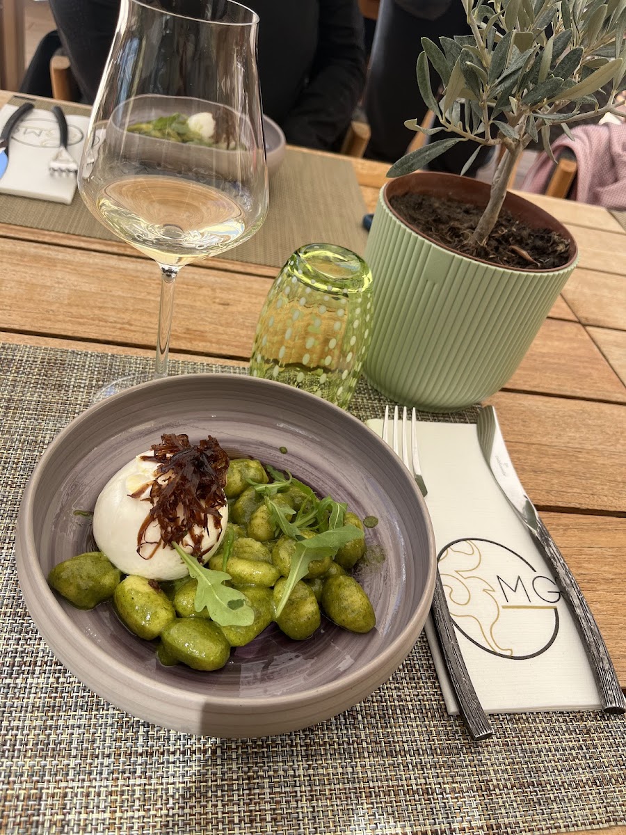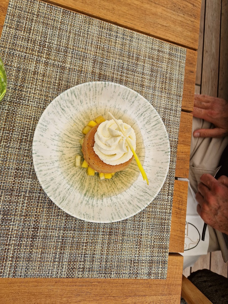 DELICIOUS! Everything was fresh and delicious. Many menu choices, too. (Menu suggests wine for each dish too, which was nice given all the great wine here to choose from.) The artichoke bread to share was fantastic. Could easily be a meal. My husband and I could not finish it but definitely wanted to. The sea bass was one of the best dishes I've had after 2+ weeks in CdP. My husband had the lamb stew, and it was so flavorful and filling. We enjoyed great wine and a baba rhum for dessert. Prices are reasonable given the quality of the food. Sit outside if you can. The view is gorgeous. Excellent service, too. We'll definitely be back!
